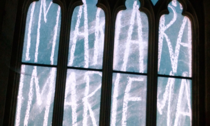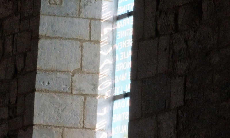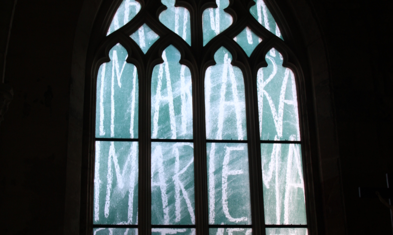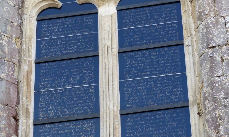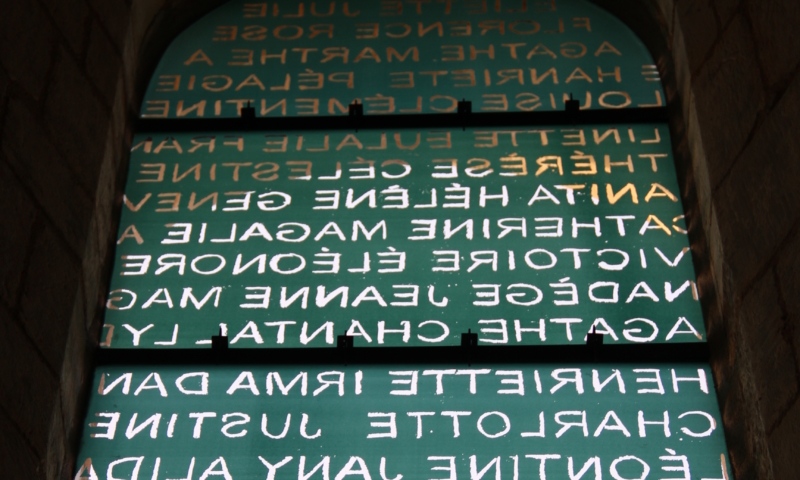 Ces 7 vitraux nous font voyager entre les mondes profane et religieux. Inspirée des noms de famille inscrits sur les plaques en céramique des bancs de l’église, Sylvie Blocher dédie son œuvre aux femmes. Grâce à un travail de recherche dans l’état civil, les vitraux reprennent les prénoms des femmes ardinoises depuis la Révolution. Le vitrail du chœur rend hommage, en plusieurs langues, à Marie à qui est dédiée l’église. Un jeu de lumières et de reflets, créé grâce à l’apparition du soleil, projette sur le sol et les murs des images mobiles, comme une « assemblée silencieuse mais toujours en mouvement ».
